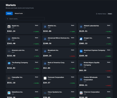 To start trading, first deposit funds into your wallet by navigating to the Wallet page and clicking 'Deposit'. Once your deposit is approved by an admin, you can browse stocks and mutual funds on the Markets page and place buy orders.